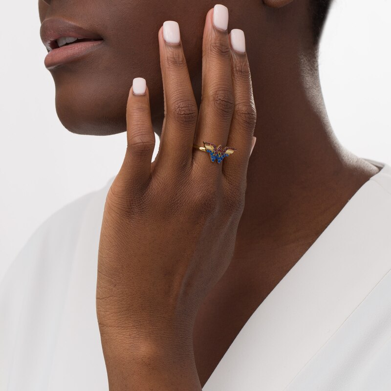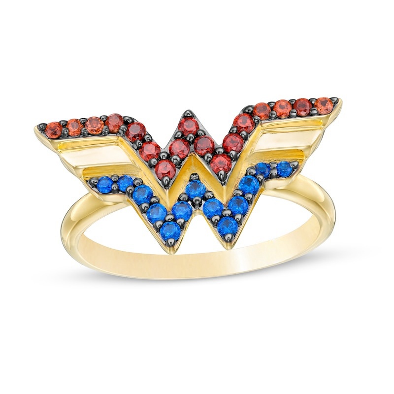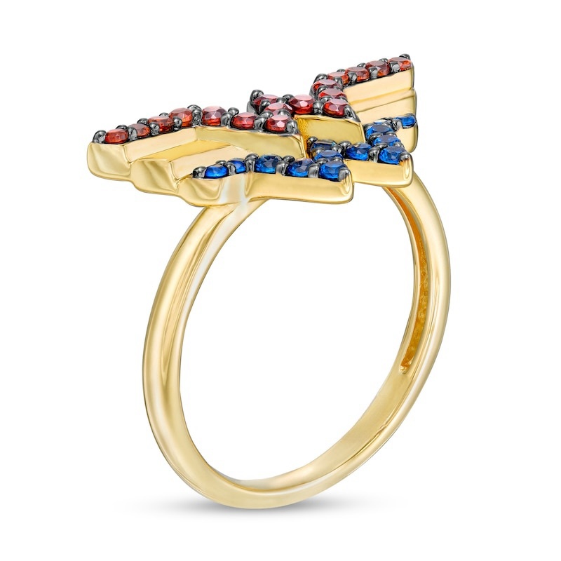 Crafted in warm 10K gold, this striking design features bright blue sapphires and noble garnets. Polished to a brilliant polished sheen, this ring is sure to stand out.